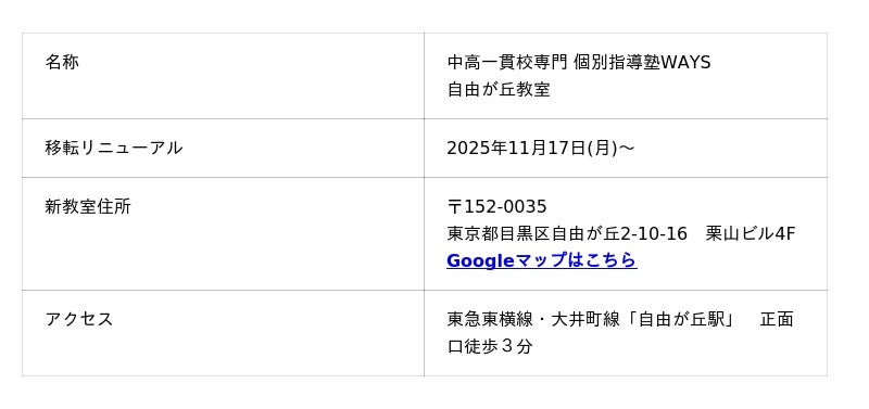 中高一貫校専門 個別指導塾WAYS(運営:株式会社メイツ)は、多くの生徒様・保護者様からのご支持をいただき、在籍生徒数が200名を突破いたしました。この度「WAYS自由が丘教室」を2025年11月17日(月)に拡大移転し、リニューアルオープンが完了しましたことをご報告いたします。