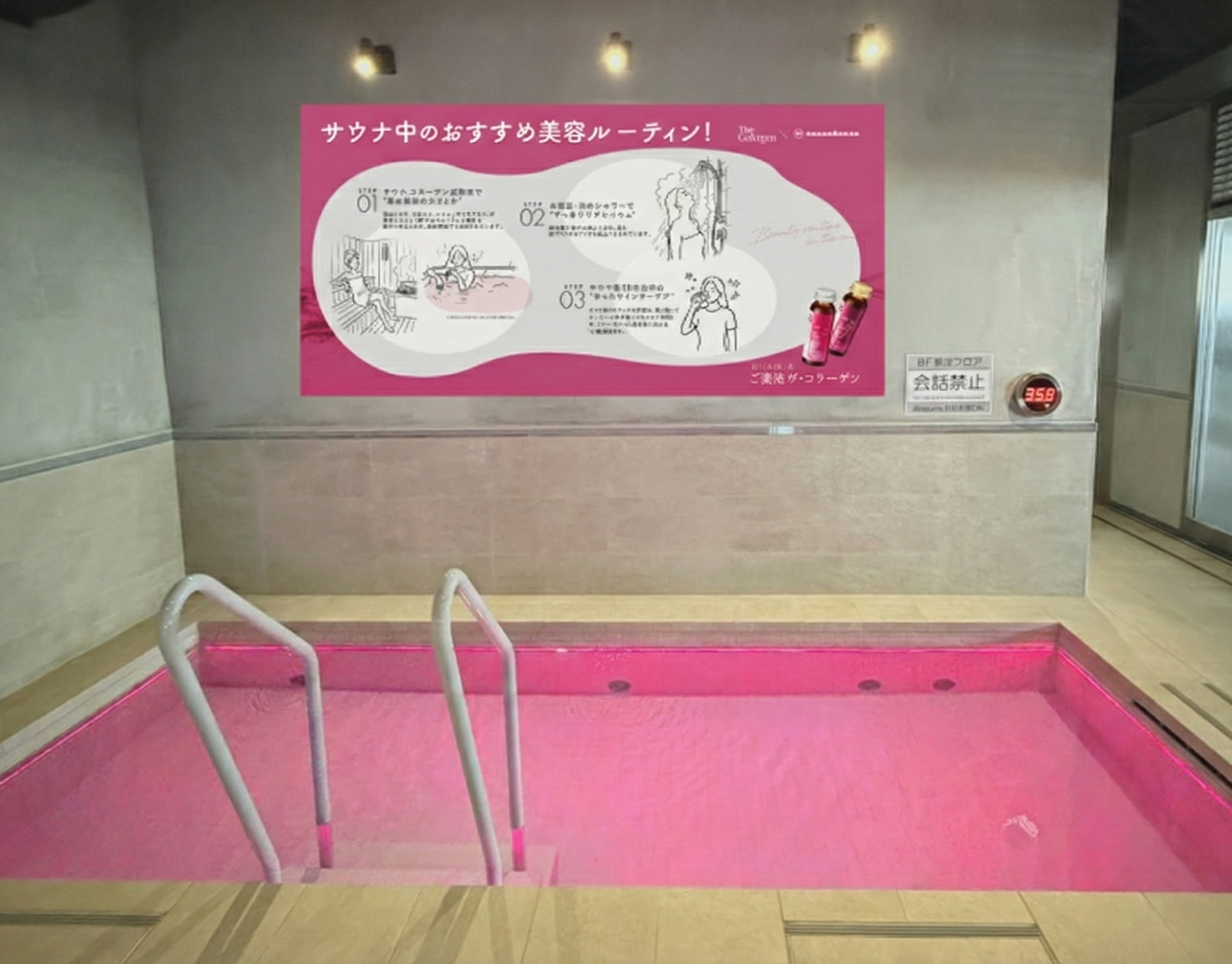 「サウナ中のおすすめ美容ルーティン」は浴室内(女性フロア限定)にも掲示され、イベント期間中は「saunahouse」のサウナ・温浴体験中にいつでも確認できます。