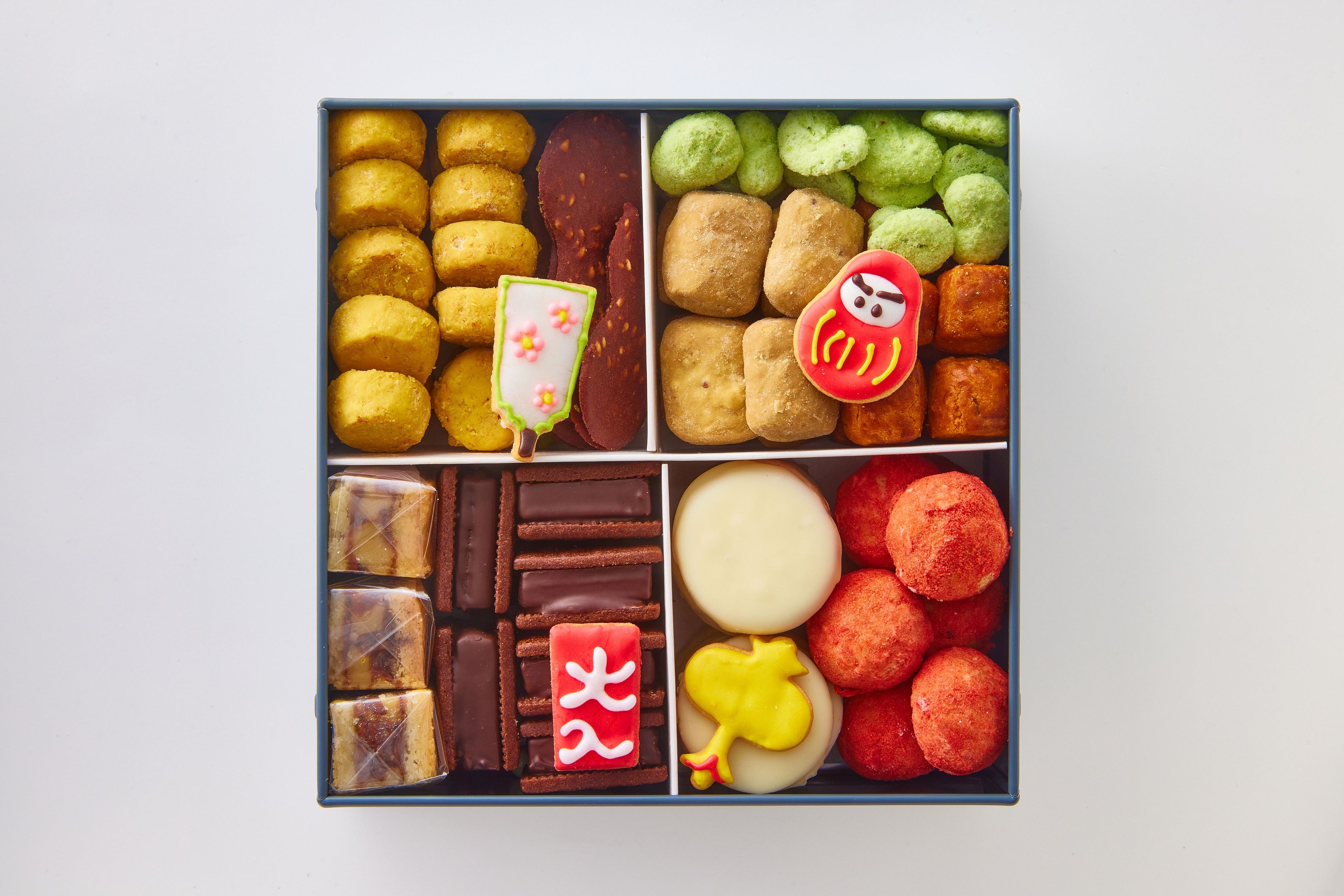 低糖質素材の大人向けクッキー缶「朔音(さくのね)」から、ワインやビールに合う塩味クッキー5種(青唐辛子、花椒チーズ、枝豆昆布、ごぼうマスタード、白味噌トマト)を厳選。期間限定のリッチな「濃いちご玉」と「柚子ホワイト」に加え、本缶限定となる洋菓子ぎをんさかいの人気商品「洒□(しゃかく)」と「花くるみ」のミニサイズを詰め合わせました。お正月をイメージした縁起の良いアイシングクッキーを添えた、今だけの特別なクッキー缶です。