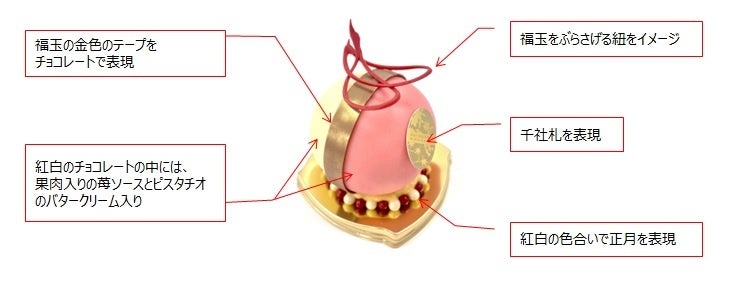 紅白のチョコレートで正月を演出し、中には、果肉入りの苺ソースとピスタチオのバタークリー