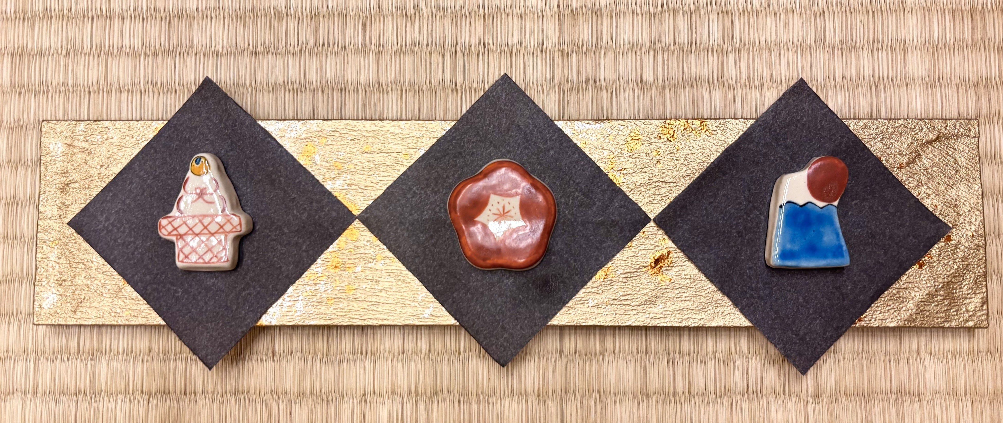 別添えの陶芸箸置き(左から鏡餅、梅、富士山)