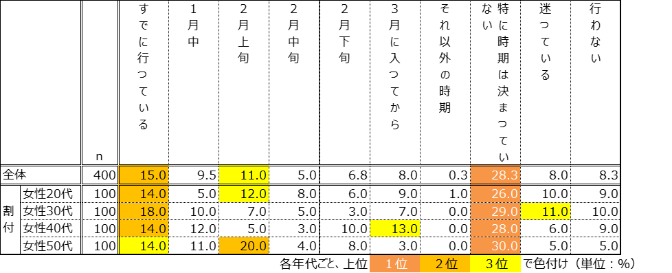 - 一方で、「特に時期は決まっていない」28.3%、「迷っている」8.0%、「行わない」8.3%も存在し、「何をいつからやればいいのか」悩んでいる層も少なくないようです。
