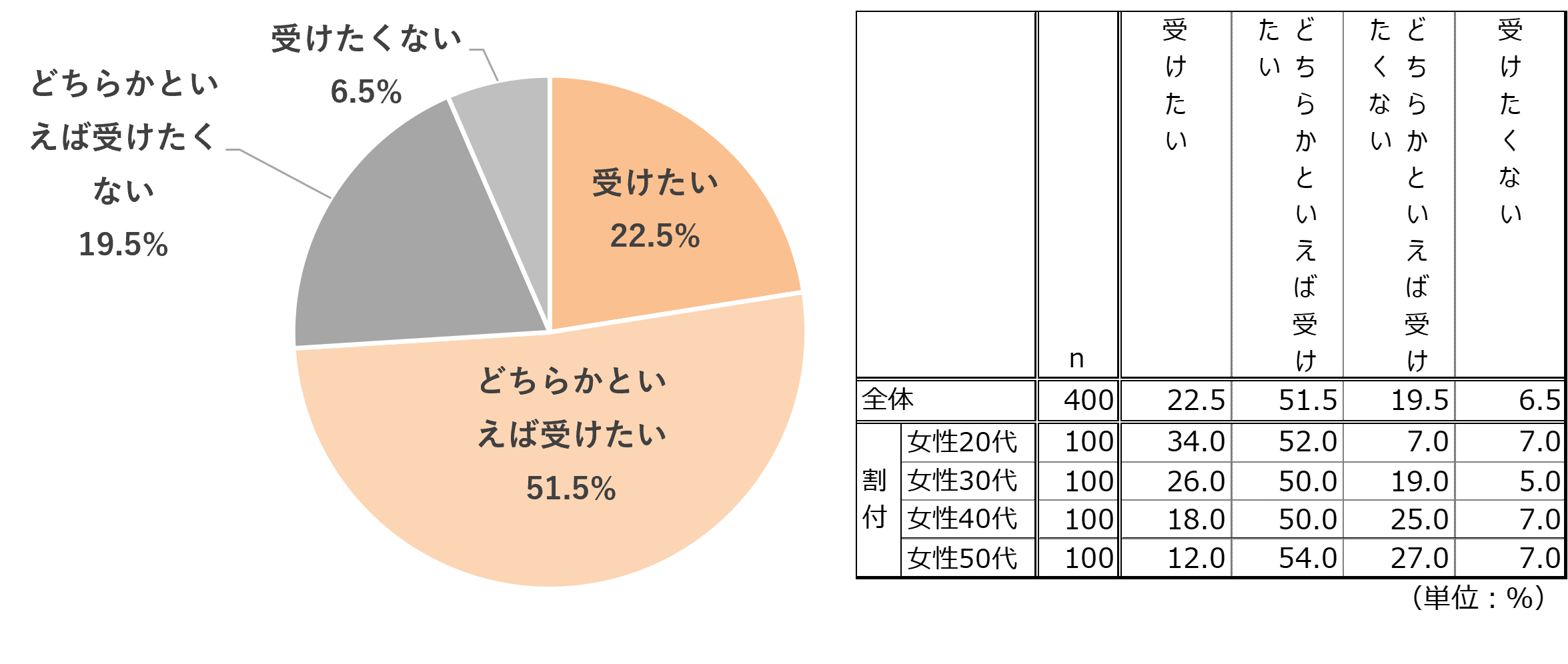 - 特に20代では「受けたい」が34.0%と高く、若い世代ほど早めに専門家の意見を取り入れたい、という傾向が見られました。