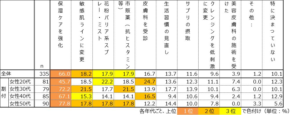 - 2026年春の花粉シーズンの肌荒れ予防として行っている/行う予定の対策は、「保湿ケアを強化」が66.0%で最多、「敏感肌ラインへの変更」18.2%、「花粉バリア系スプレー・ミスト」17.9%、「市販薬(抗ヒスタミン等)」17.9%、「皮膚科を受診」16.7%などが挙がりました。