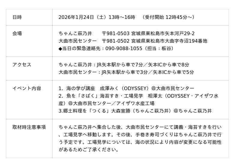 一般社団法人 海のごちそう推進機構と一般社団法人ODYSSEYは、東松島市の特産品である海苔を作る海苔すき体験、地域の海洋変化や海藻について学ぶこと、さらに地域の郷土料理に根差した調理体験など、日本の豊かな海の食文化を継承し輪を広げる取組み(第二回)「日本さばける塾 in 東松島」を1月24日(土)に開催いたします。