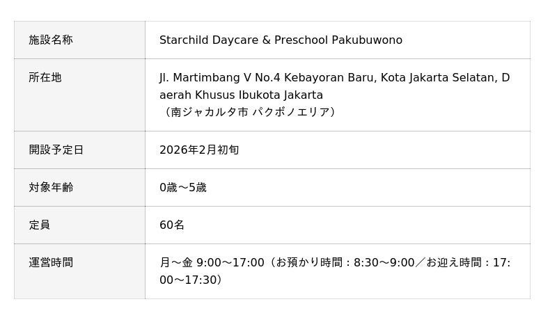 ヒューマンアカデミー株式会社の事業子会社で保育事業を展開するヒューマンスターチャイルド株式会社(本社:横浜市、代表取締役:川下 裕左、以下「当社」)は、ヒューマンホールディングス株式会社の子会社であるPT. HUMAN CITA ANANDA(本社:インドネシア・南ジャカルタ市、以下「HCA社」)が、インドネシア国内で2拠点目となる保育施設(以下「当園」)を、2026年2月初旬、南ジャカルタ市の高級住宅街であるパクボノエリア(Kebayoran Baru)に開設することをお知らせいたします。 当園は、これまでにインドネシア現地で提供してきた日本式のきめ細やかな保育ノウハウに加え、新たに「モンテッソーリ教育」の要素を取り入れたハイブリッドな教育カリキュラムを展開いたします。