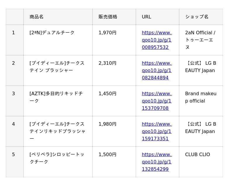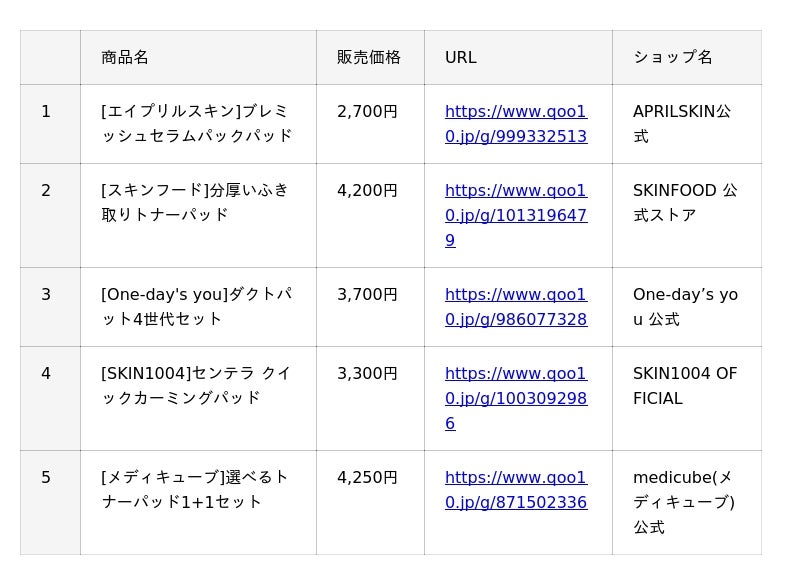 Qoo10(https://www.qoo10.jp/)サイト上、「スキンケアパッド」「リップメイク」「アイシャドウ」「チーク」カテゴリーの公式ショップ各販売個数に基づいたランキングです。