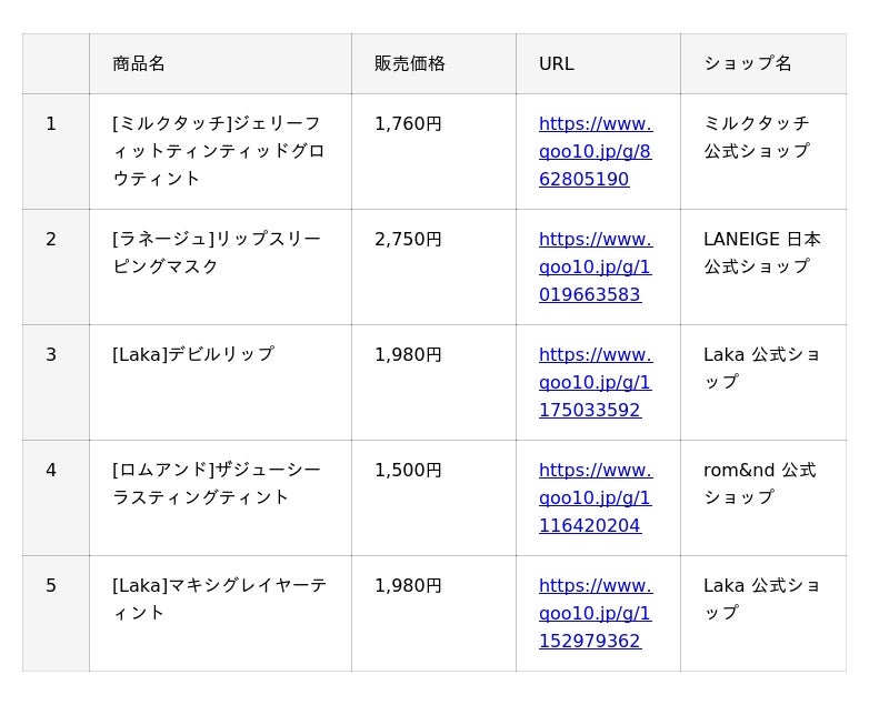 インターネット総合ショッピングモール「Qoo10」を運営するeBay Japan合同会社(本社:東京都港区、代表取締役:グ ジャヒョン)は、Qoo10で人気のコスメカテゴリーの中から、『リップ』『アイシャドウ』『チーク』と、月替わりで1アイテムをピックアップした、月間販売数TOP5※をご紹介していきます。