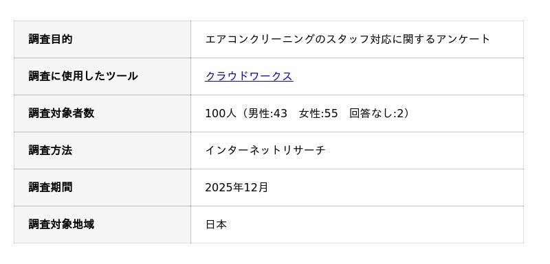 エアコンクリーニングのスタッフ対応に関するアンケート調査の概要