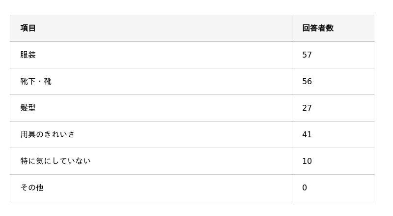 - スタッフの身だしなみについては「服装」「靴下・靴」が最も見られており、「用具のきれいさ」も注目されることがある。