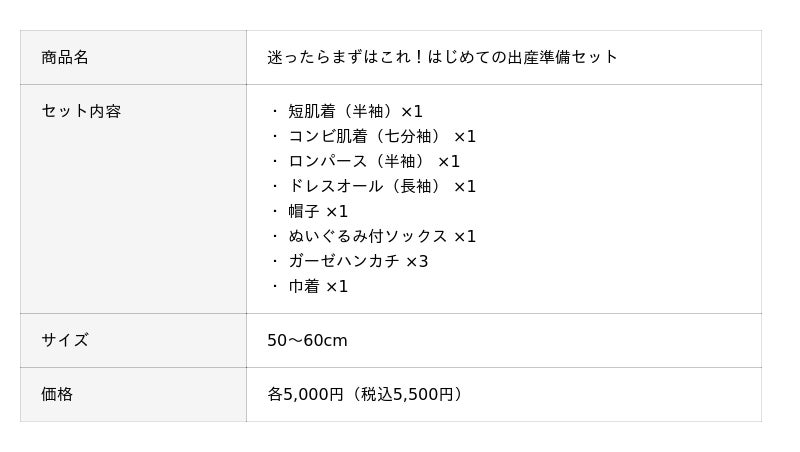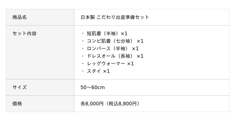 生まれてすぐの赤ちゃんが身に着けるアイテムを、すべて日本製で揃えたセットです。