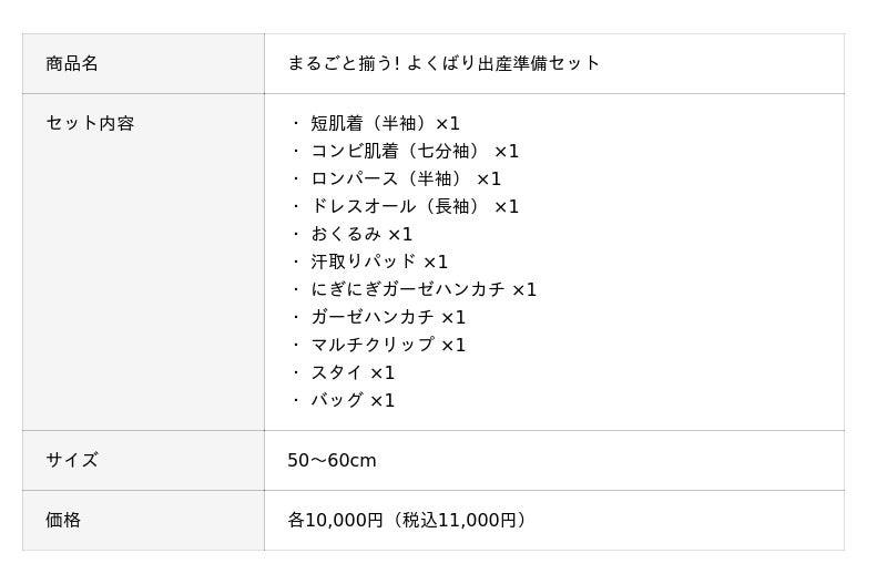 新生児~6か月頃までの赤ちゃんに必要な11アイテムがセットになっています。本体の素材は全て綿100%。