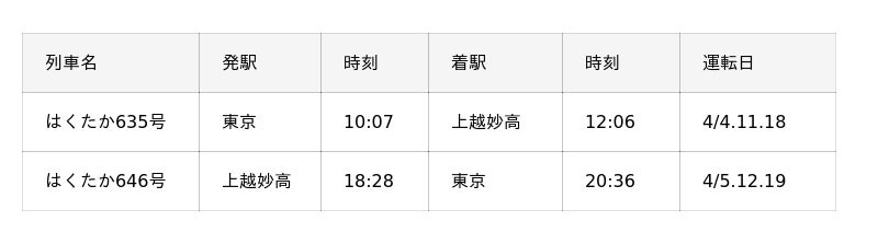◆GALA湯沢スキー場直通の主な臨時列車は以下の通りです。