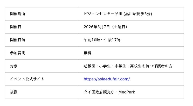 本イベントは、「タイ・東南アジアにおける多様な教育の選択肢を、正確かつ直接届けること」をテーマに、これからタイへ赴任予定のご家庭、母子留学や教育移住を検討されている方、ボーディングスクールを検討されているお子様、サマースクールへの参加を検討している方を主な対象として開催されます。