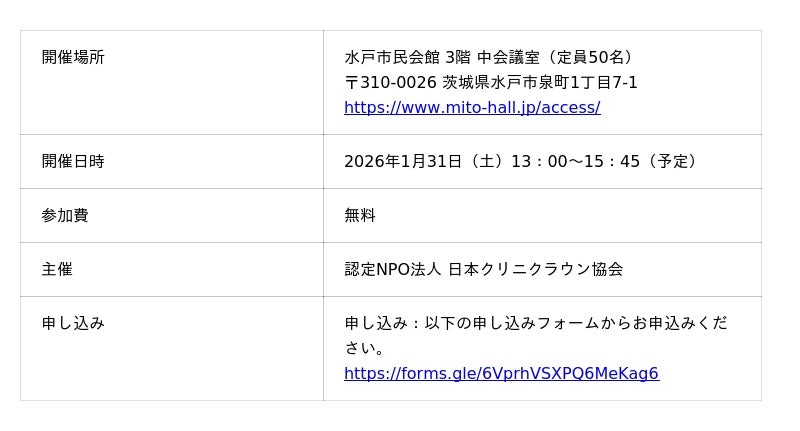 [多職種でつながる勉強会「こどもにやさしい医療って?~茨城のこども医療をみんなで考えよう] - [認定NPO法人日本クリニクラウン協会]主催、[2026年1月31日(土)13時~水戸市民会館]開催