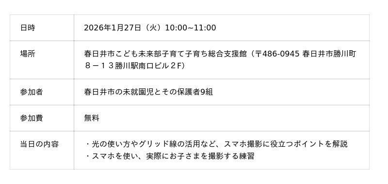 本取り組みは、春日井市に本社を置く写真館として培ってきた撮影ノウハウを生かし、地域の子育て世代の皆さまに、日常的に使うスマートフォンでの撮影に役立つポイントを伝えることを目的に実施しました。本講座は、春日井市子育て子育ち総合支援館と連携して開催しています。初開催となった昨年度には10組の親子が参加し、「毎日使うスマホだからこそ、プロから具体的なコツを聞けて参考になった」「逆光の捉え方など、これまでの思い込みが変わった」といった声が寄せられました。こうした反響を受け、本年度も継続開催に至りました。