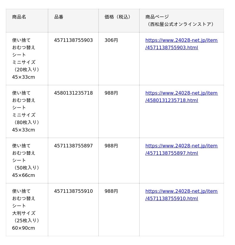 株式会社西松屋チェーン(兵庫県姫路市、代表取締役社長:大村浩一)は、使い捨てで衛生的・コンパクトで持ち運び簡単な商品「使い捨ておむつ替えシート」を開発、全国の当社店舗および西松屋公式オンラインストアにて販売をしております。