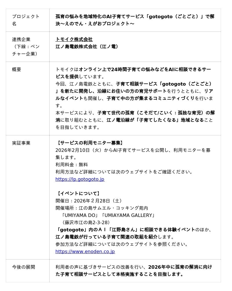 株式会社eiicon(エイコン 本社所在地:文京区後楽、代表取締役社長:中村 亜由子、以下「eiicon」)が運営する日本最大級のオープンイノベーションプラットフォーム「AUBA(アウバ)」は、神奈川県より受託運営する 神奈川県が主催し県の大企業とベンチャー企業との事業連携プロジェクト創出を目指す協議会「ビジネスアクセラレーターかながわ(略称:BAK:バク、以下BAK)」による、大企業とベンチャー企業によるオープンイノベーション促進のためのプログラム「BAK2025(以下 本プログラム)」採択プロジェクトのうち、トモイク株式会社と江ノ島電鉄株式会社(江ノ電)による実証事業「孤育(こそだて/こいく:孤独な育児)の悩みを地域特化のAI子育てサービス「gotogoto(ごとごと)」で解決 ~えのでん・えがおプロジェクト~」を開始することをお知らせします。