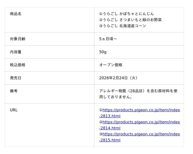 ピジョン株式会社(本社:東京、社長:矢野 亮)は、生後5ヵ月頃から食べられるピジョン ベビーフード 「うらごし かぼちゃとにんじん」「うらごし さつまいもと緑のお野菜」「うらごし 北海道産コーン」を、2026年2月24日(火)より全国のベビー用品専門店・ドラッグストア、当社公式オンラインショップにて販売を開始いたします。