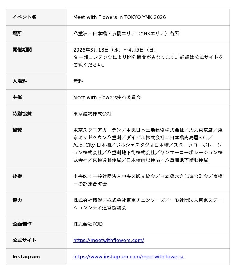 東京建物株式会社が実行委員として参画するMeet with Flowers実行委員会は、2026年3月18日(水)から4月5日(日)まで、フラワーイベント「Meet with Flowers in TOKYO YNK 2026」(以下「本イベント」)を開催します。2021年にスタートし第6回を迎える本イベントでは、会期中、八重洲・日本橋・京橋エリア(YNKエリア)内の20カ所で、来街者やオフィスワーカーに向けた国産切り花等の配布や現代的ないけばな作品の展示、花を感じるワークショップや音楽ライブ等、花に関連したコンテンツを同時展開します。