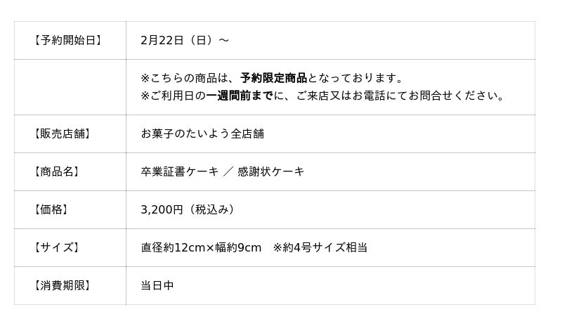 株式会社太陽社(所在地:千葉県匝瑳市飯倉293、代表取締役:片岡正裕)が展開する、千葉県で長年愛され続ける菓子店「お菓子のたいよう」では、世界にひとつのオーダーメイド・メッセージケーキ『卒業証書ケーキ』および『感謝状ケーキ』の予約受付を、2月22日(日)より開始いたします。
