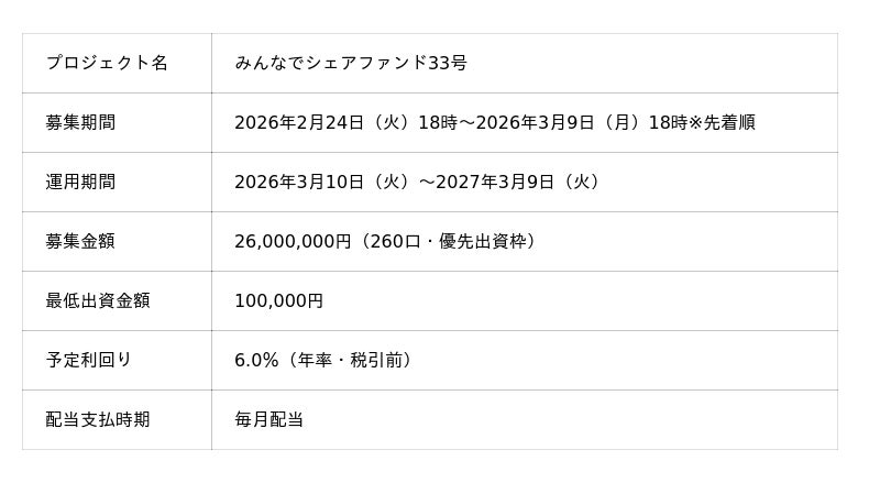 『みんなでシェアファンド』33 号ファンド 2026年2月24日(火)18時より先着順にて募集開始