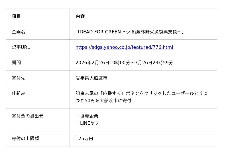 LINEヤフー株式会社(以下、LINEヤフー)は、サステナビリティに関するニュースやアイデアを届ける「サストモ」の新企画として、記事を読むことが森林再生の支援につながる「READ FOR GREEN(リード・フォー・グリーン)」を開始します。復興や森林再生などの社会課題を扱う特集記事を読了したユーザー数に応じて森林再生に向けた寄付を行い、ユーザーは「知ること」「読むこと」といった日常の行動を通じて社会課題の解決に参加できる新たな支援モデルです。第1弾として「READ FOR GREEN ~大船渡林野火災復興支援~」を2026年2月26日から3月26日まで実施します。2025年2月26日に発生した岩手県大船渡市の大規模林野火災からの復旧・復興支援として、特集記事を公開し、記事末尾の「応援する」ボタンをクリックしたユーザー※1ひとりにつき50円を大船渡市に寄付します。