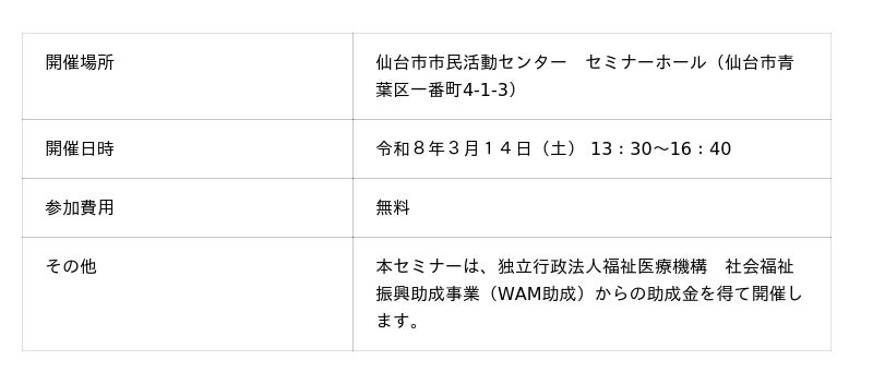 社会福祉法人つどいの家(所在地:宮城県仙台市、理事長:佐藤清)は、令和8年3月14日(土)、病気や障がいのある子の兄弟姉妹=「きょうだい児」をテーマにしたセミナーを開催いたします 。