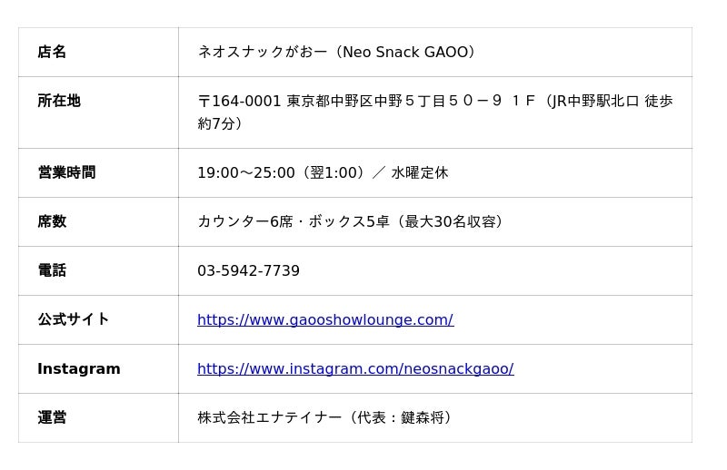 株式会社グレイド(本社:東京都渋谷区、代表取締役:澤田佳宏)のグループ会社である株式会社エナテイナー(代表:鍵森将)が運営する、東京・中野の体験型ネオスナック「ネオスナックがおー」は、2025年12月の全面リニューアルを経て、客足が前年比約1.5倍に増加しています。