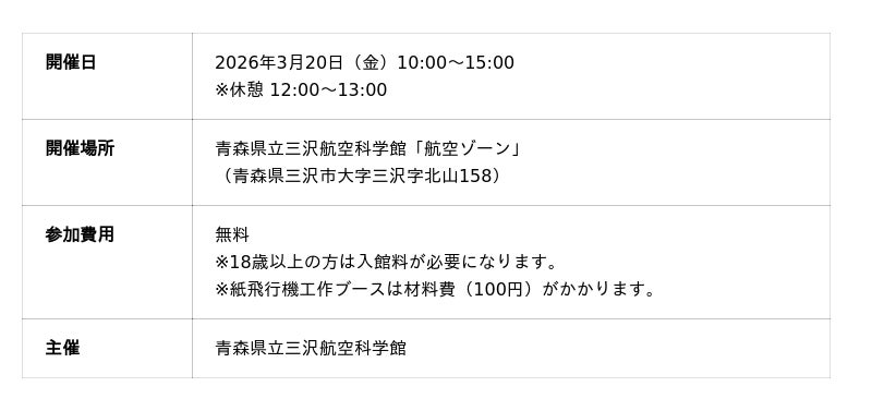 JAF(一般社団法人日本自動車連盟)青森支部(支部長 大野 亮)は、3月20日(金・祝)、青森県立三沢航空科学館(青森県三沢市大字三沢字北山158)にJAFブースを出展します。