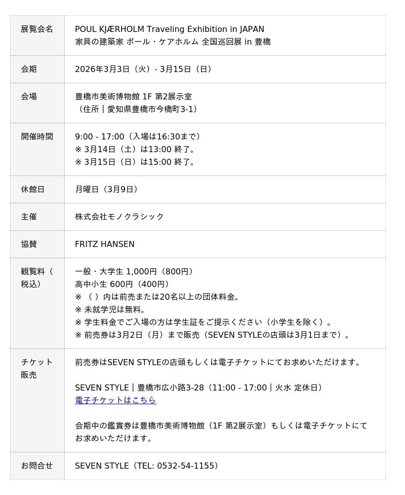 ハンセン)」協賛のもと、20世紀デンマークを代表する家具デザイナー「POUL KJÆRHOLM(以下、ポール・ケアホルム)」の展覧会を豊橋市美術博物館にて開催する運びとなりました。