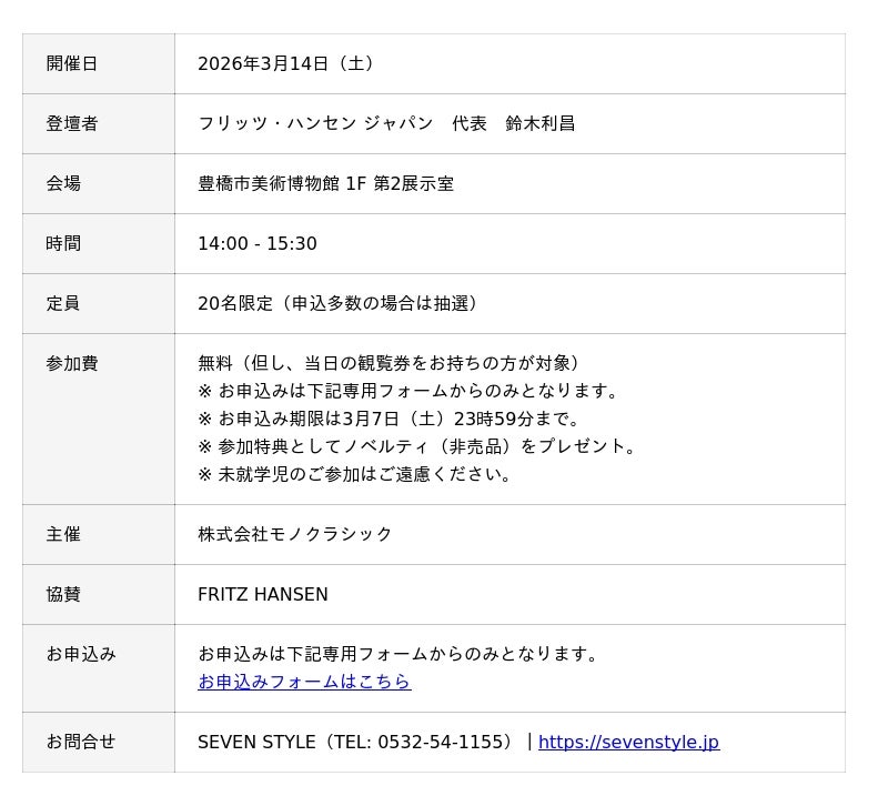 株式会社モノクラシック(本社:愛知県豊橋市、代表取締役:杉浦公治、以下「弊社」)は、2026年3月3日(火)よりデンマークのインテリアデザインブランド「FRITZ HANSEN(以下、フリッツ・