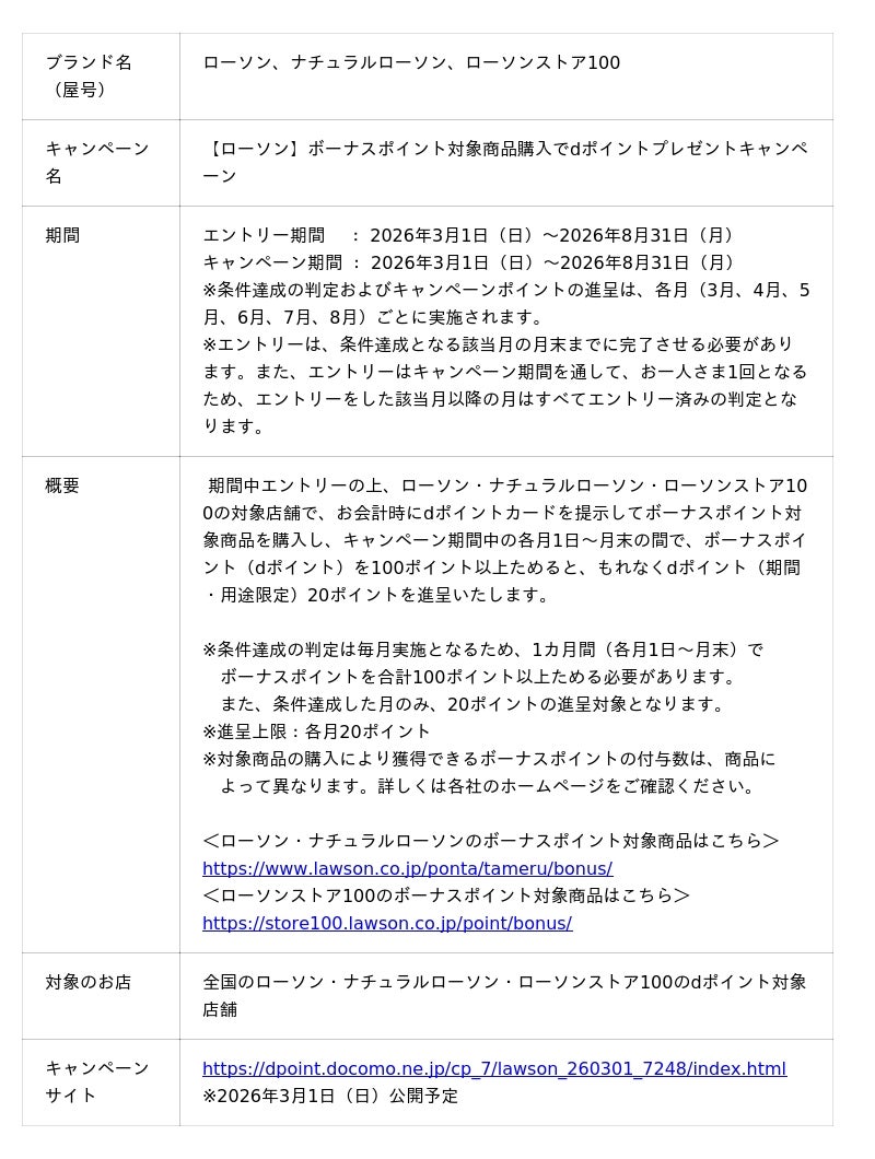 株式会社NTTドコモ(以下、ドコモ)は、ローソン・ナチュラルローソン・ローソンストア100において「【ローソン】ボーナスポイント対象商品購入でdポイントプレゼントキャンペーン(以下、本キャンペーン)」を、2026年3月1日(日)から2026年8月31日(月)までの期間で開催いたします。