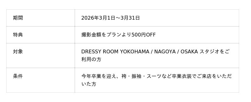 セルフ写真館 PICmiiは、カメラ専門店「カメラのキタムラ」のグループ会社として、撮影画質の仕上がりにこだわったセルフ写真館で、個室での自由な撮影をお楽しみいただけます。DRESSY ROOM YOKOHAMA/NAGOYA/OSAKAスタジオでは、3月限定で『卒業フォト割』を実施。3/1~3/31の期間、今年卒業を迎え、袴・振袖・スーツなど卒業衣装でご来店をいただいた方は、ご利用料金より500円OFFとさせていただきます。(記事を見た旨をお伝え下さい。)