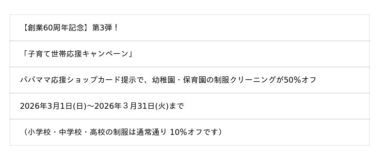 通常、パパママ応援ショップカード提示で、幼稚園・保育園・小学校・中学校・高校の制服クリーニングが10%オフのところ、幼稚園・保育園の制服に限りまして、クリーニング料金が50%オフとなる「子育て世帯応援キャンペーン」を開催します!