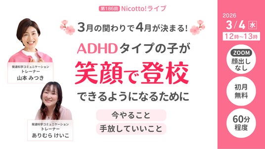 (株)パステルコミュニケーション(本社:東京都豊島区、代表取締役:吉野加容子)が運営する、発達障害・グレーゾーンの子どもを育てるママがいつでも学べて相談できるオンライン子育て塾「Nicotto!塾」は、2026年3月4日(水)お昼12時より、「ADHDタイプの子が笑顔で登校できるようになるために今やること手放していいこと」をテーマにオンラインライブを開催いたします。
