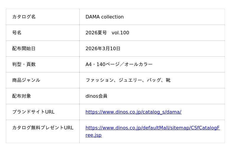 株式会社dinos(本社:東京都中野区、代表取締役社長:加藤 浩輔)は、50代からの大人女性に向けたファッションブランド『DAMA collection(ダーマ・コレクション)』のカタログvol.100を、2026年3月10日に発刊しました。