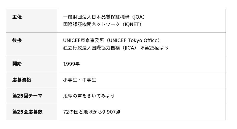 「JQA地球環境世界児童画コンテスト」は、子どもたちに絵を描くことを通じて環境問題について考える機会を提供することを目的に、UNICEF東京事務所(東京都渋谷区)と独立行政法人国際協力機構(東京都千代田区、略称:JICA)の後援(※)のもと1999年より毎年開催しています。また、国内の美術館などで展示会を開催し、多くの人たちに子どもたちの地球環境へのメッセージを伝えています。※JICAの後援は第25回より