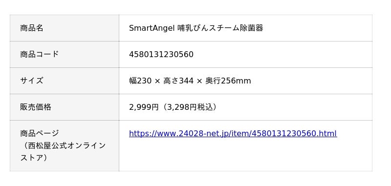 株式会社西松屋チェーン(兵庫県姫路市、代表取締役社長 大村 浩一)は、プライベートブランド「SmartAngel(スマートエンジェル)」の新商品として、「SmartAngel 哺乳びんスチーム除菌器」を全国の当社店舗および西松屋公式オンラインストアにて販売を開始いたしました。