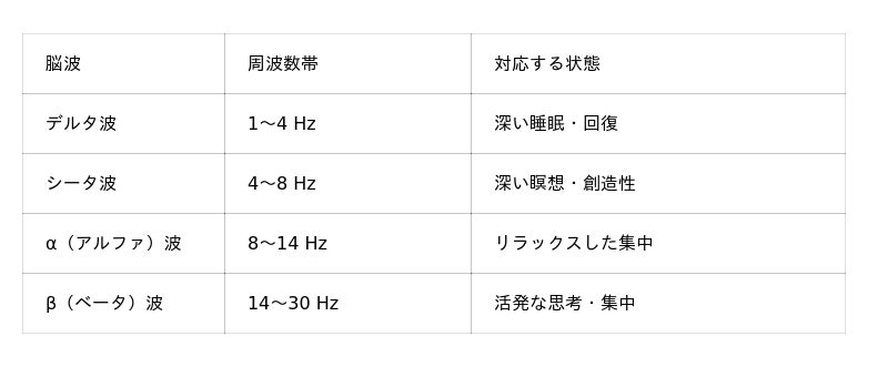 バイノーラルビートとは: 左右の耳にわずかに異なる周波数の音を聴かせた際に、脳がその差分を「うなり」として知覚する聴覚現象です。脳波がこのビートの周波数に同調する「周波数追従効果」が生じるとされ、目的に応じた精神状態へ導くためのツールとして研究されています。